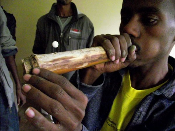 1. Block one end of a tube. Bamboo has useful blocked joints but other tubes will need a good stopper to make sure no air gets out,- for example, a piece of a plastic bag can be tied on to the end.